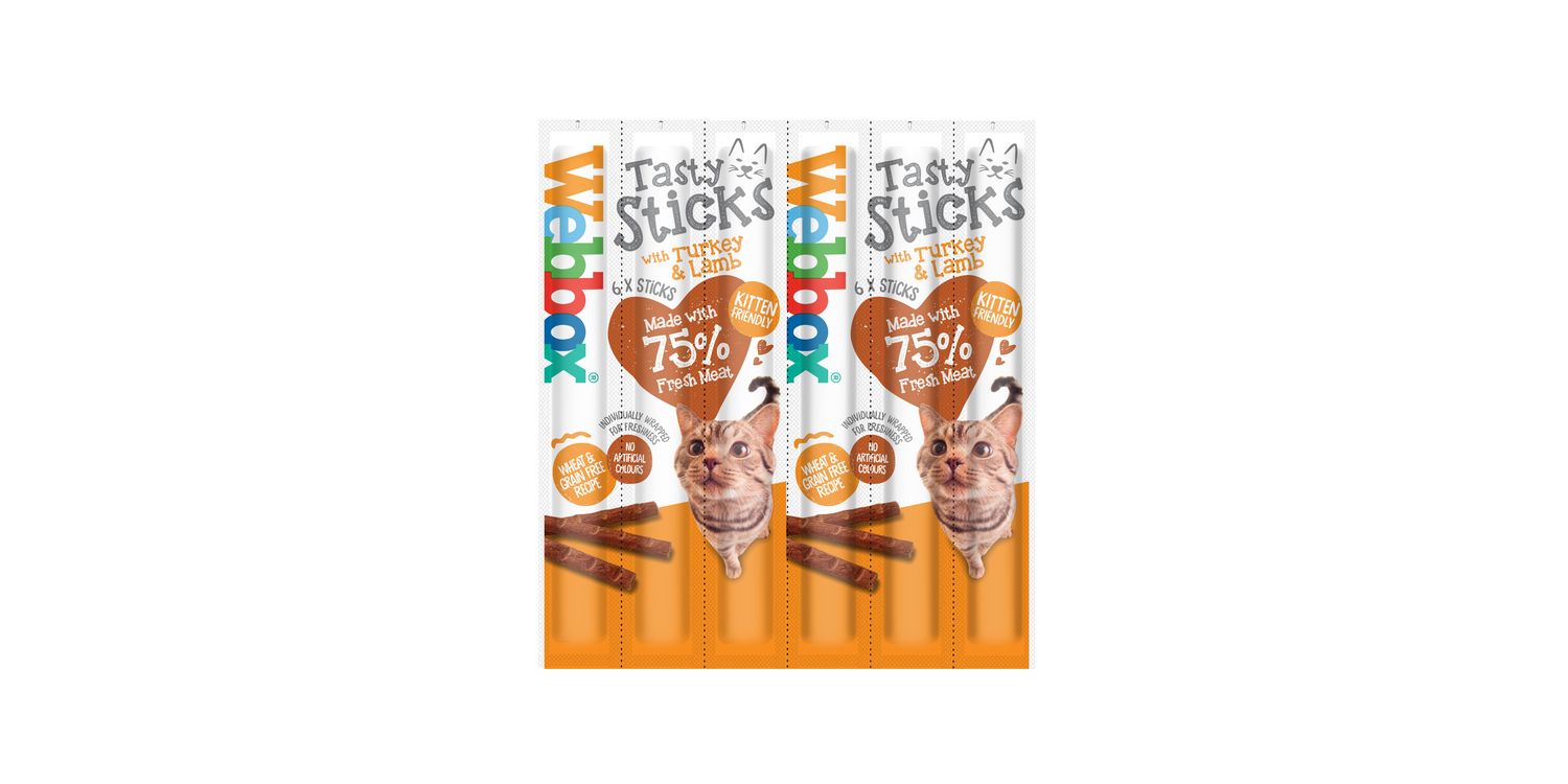 Webbox Tasty Sticks are a delicious treats for cats & kittens. Perfect to feed at any time as a tasty, chewable snack, they are gently cooked and contain 75% yummy meat that your cat will adore! Each stick is individually wrapped for freshness - to open, simply tear open from the top of the pack.