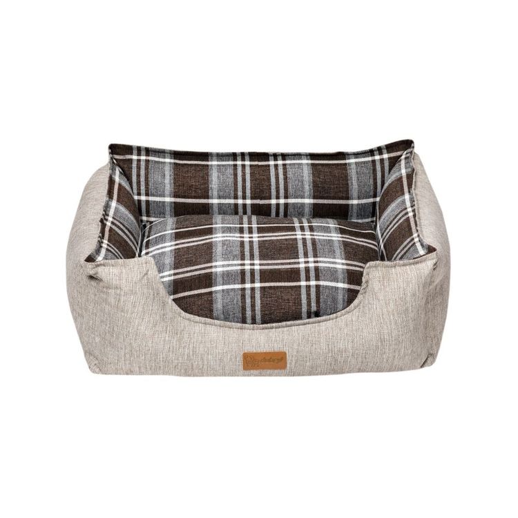 A refined choice for modern interiors, this rectangular dog bed features a sleek light grey linen outer paired with a dark tartan inner cushion for a touch of classic contrast.