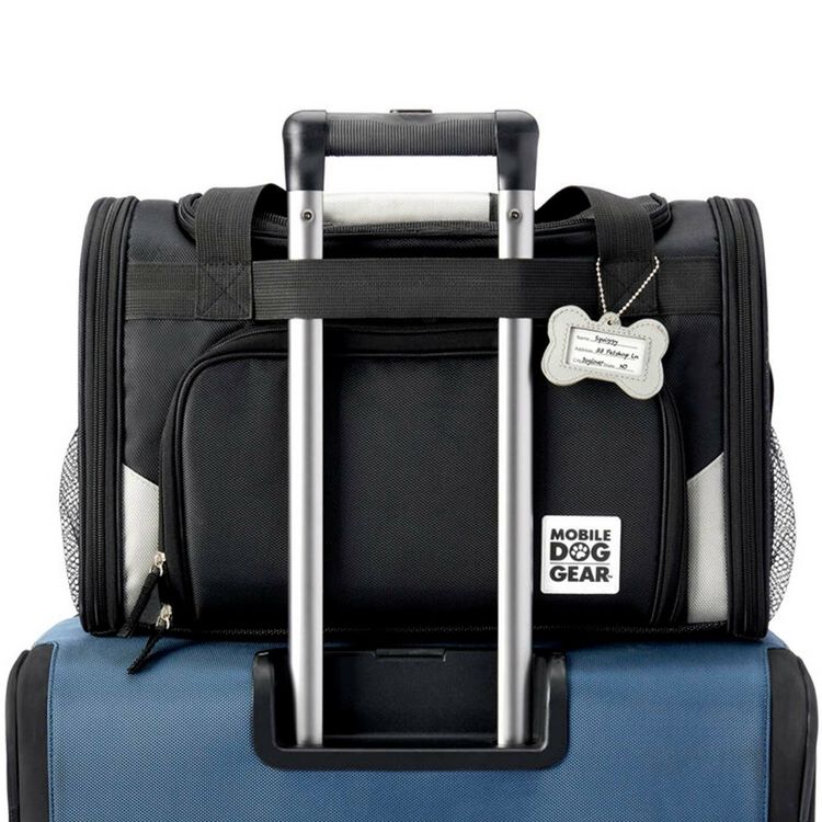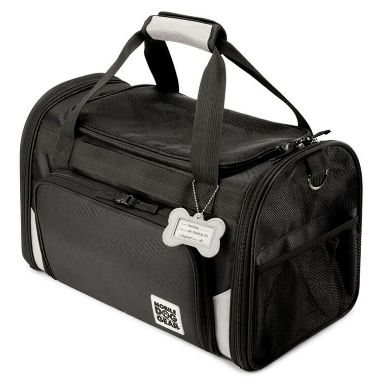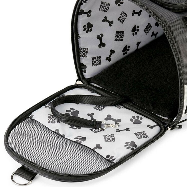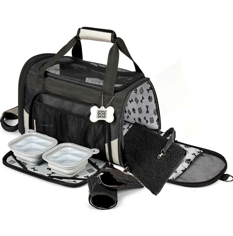 Mobile Dog Gear Pet Carrier Plus allows you to travel with your dog with ease as it not only keeps your dog safe, but comes with our patented feeding system design. (Two lined food/treat carriers, two collapsible silicone bowls and removable placemat)
