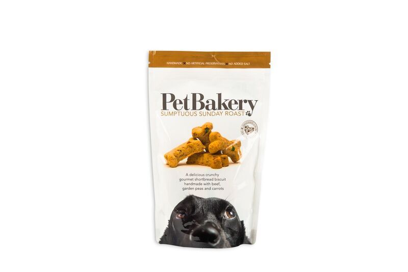 The Pet Bakery Sumptuous Sunday Roast Bones are a delicious crunchy gourmet shortbread biscuit made with beef, garden peas and carrots.