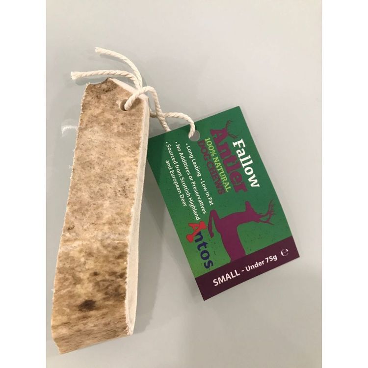 Antos Fallow Antler Small (Under 75g). All natural, long lasting dog chew. Suitable for puppies, good for dental care, from Scottish Highland and European fallow deer. Sold in singles.