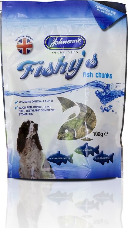 Fish Chunks 100g packs. Made from 100% Fish Skins. Helps promote a healthy coat & skin. Aids teeth and joint care and are gentle on digestion making them a great treat for dogs with sensitive stomachs. 100% Natural, Hypo-Allergenic, Wheat Free, Gluten Free, No Preservatives, No Additives... a taste dogs love!