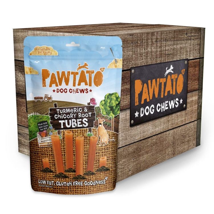 For pet food shops aiming to differentiate and provide enriching and innovative treat options, the Pawtato Turmeric & Chicory Root Tubes are a valuable consideration. These 90g packs offer 4 healthy vegan dog chews, thoughtfully created from a wholesome sweet potato base and infused with the beneficial properties of turmeric and chicory root.