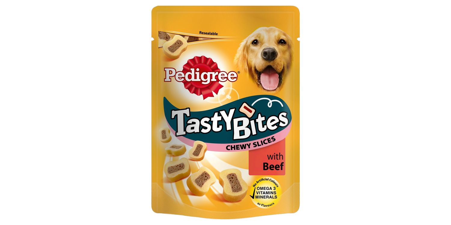 Complete with added vitamins, minerals (including protein and calcium), Omega 3 fatty acids and antioxidants, these  Pedigree Tasty Bites Chewy Slices have the succulent meaty flavour of beef and an enjoyably chewy texture that your dog will bend over backwards for! The ideal reward for any adult dog over 9 months old, these Pedigree dog treats come in a resealable pouch that helps to keep them fresh and delicious.