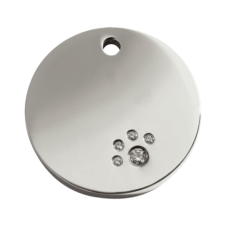 High quality personalised Dog tag by Red Dingo. Made from Stainless Steel in a stylish Diamante Paw design, this collar tag looks fantastic as well as ensuring a quick reunion should your beloved pet become lost.