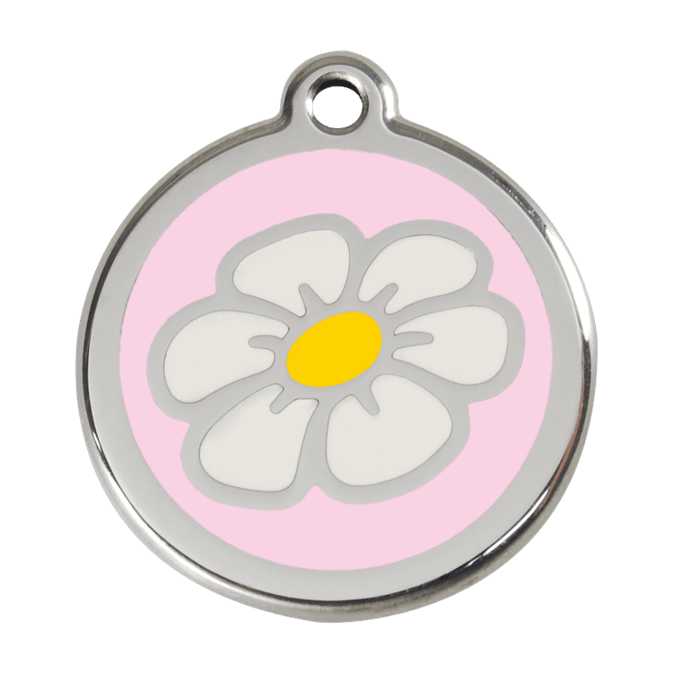 High quality personalised Dog tag by Red Dingo. Made from Stainless Steel in a stylish Pink Daisy design, this collar tag looks fantastic as well as ensuring a quick reunion should your beloved pet become lost.