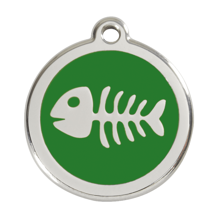High quality personalised Dog tag by Red Dingo. Made from Stainless Steel in a stylish Green Fish Skeleton design, this collar tag looks fantastic as well as ensuring a quick reunion should your beloved pet become lost.