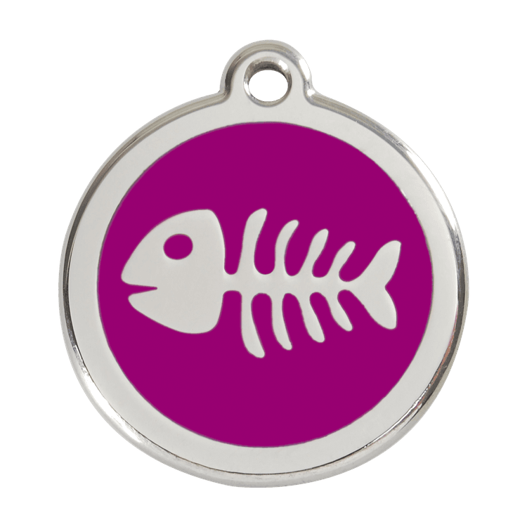 High quality personalised Dog tag by Red Dingo. Made from Stainless Steel in a stylish Purple Fish Skeleton design, this collar tag looks fantastic as well as ensuring a quick reunion should your beloved pet become lost.