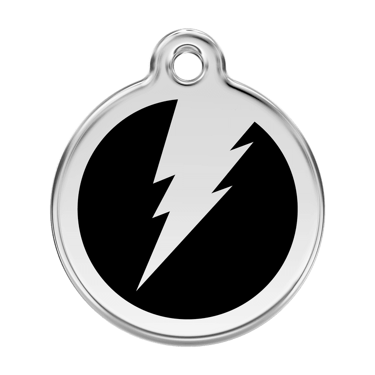 High quality personalised Dog tag by Red Dingo. Made from Stainless Steel in a stylish Black Flash design, this collar tag looks fantastic as well as ensuring a quick reunion should your beloved pet become lost.
