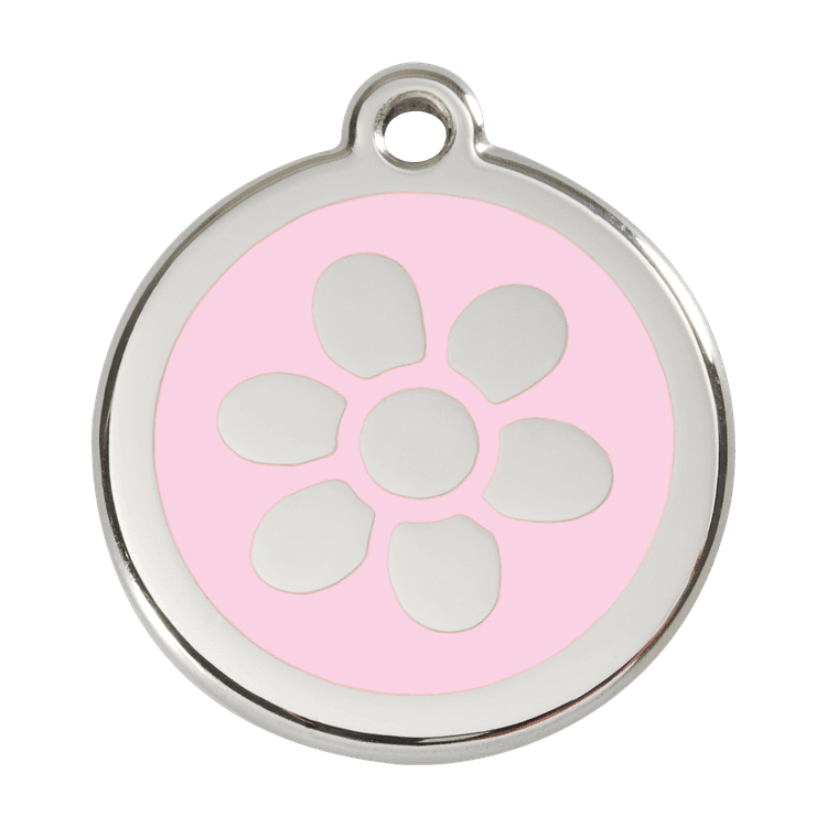 High quality personalised Dog tag by Red Dingo. Made from Stainless Steel in a stylish Pink Flower design, this collar tag looks fantastic as well as ensuring a quick reunion should your beloved pet become lost.