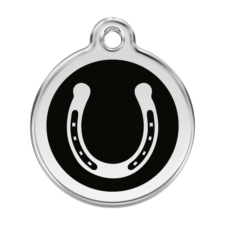 High quality personalised Dog tag by Red Dingo. Made from Stainless Steel in a stylish Black Horse Shoe design, this collar tag looks fantastic as well as ensuring a quick reunion should your beloved pet become lost.