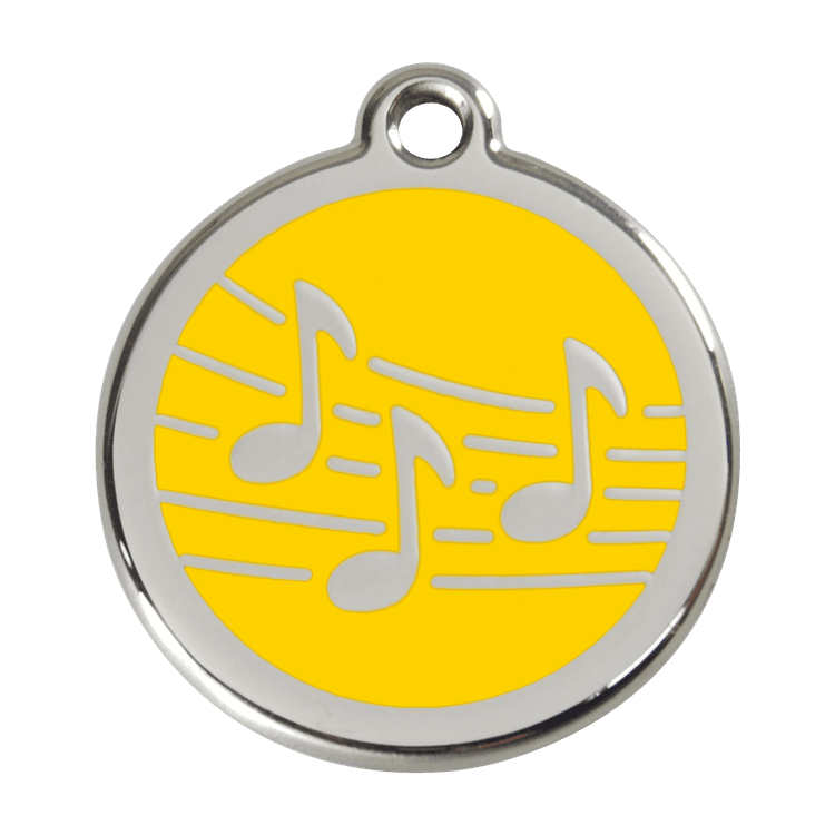 High quality personalised Dog tag by Red Dingo. Made from Stainless Steel in a stylish Yellow Music design, this collar tag looks fantastic as well as ensuring a quick reunion should your beloved pet become lost.