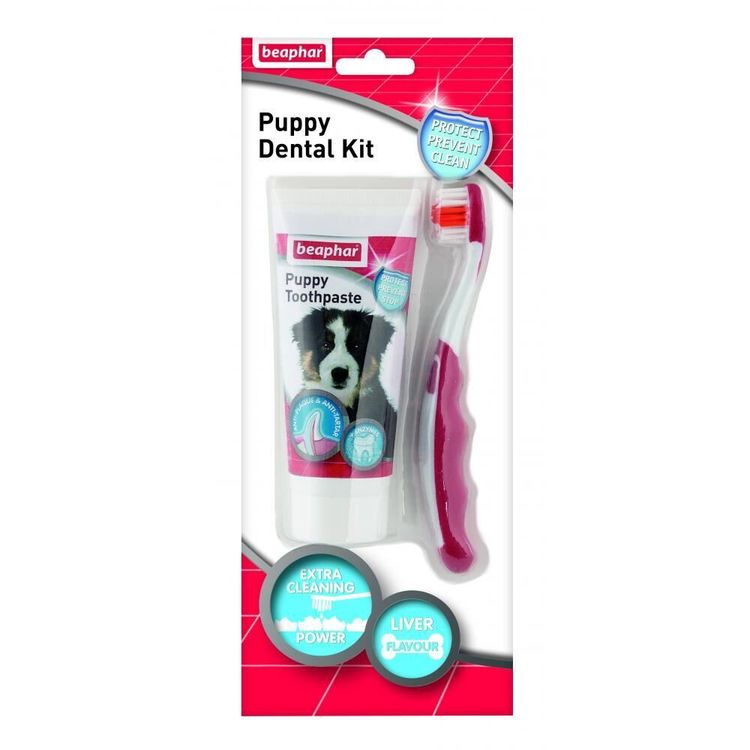 Daily protection for your puppy’s teeth, resulting in fresher breath. Contains meat-flavoured toothpaste to counteract plaque and prevent the formation of tartar, and a soft grip toothbrush with nylon bristles designed to fit little mouths and to facilitate access to hard to reach areas. Slowly introduce your puppy to having his teeth brushed by allowing them to lick and sniff the toothpaste and toothbrush and gently lift his lips and gently brush a couple of teeth. Build this up slowly until your puppy is used to having his teeth brushed.