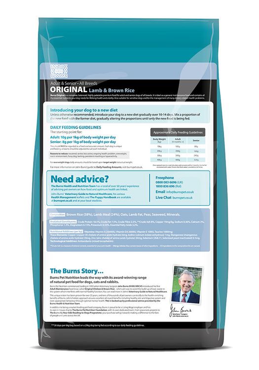 Burns Original Lamb and Brown Rice Dog Food is a hypoallergenic recipe that is full of nutrition and flavour. Made with high quality wholesome ingredients, this is a low fat meal that will ensure your dog gets a controlled amount of protein in their diet.