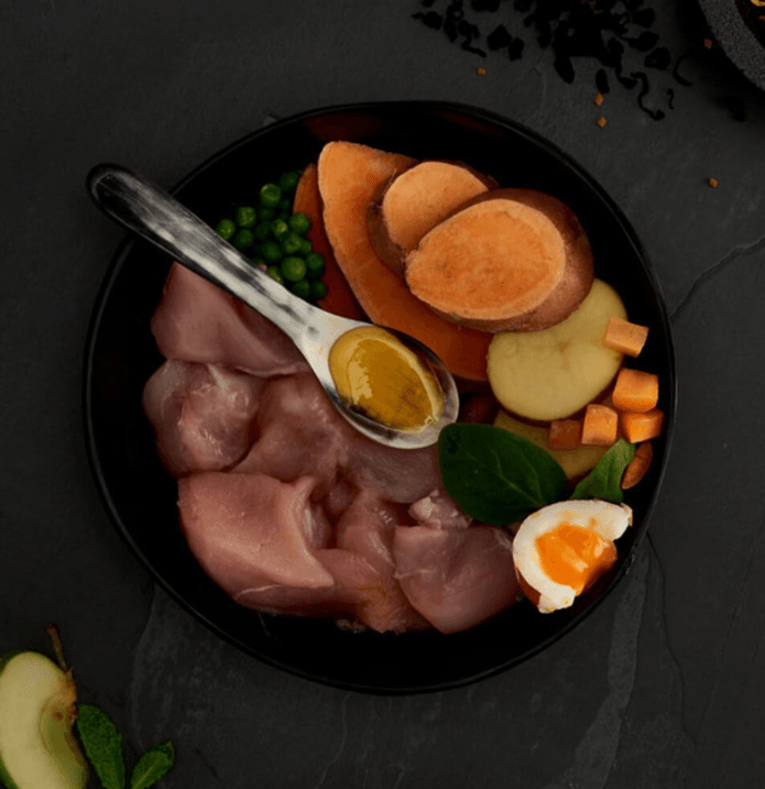 Ingredients: Freshly Prepared Free Range Chicken (26%), Dried Chicken (26%), Sweet Potato, Peas, Potato, Chicken Fat (4.2%), Alfalfa, Dried Egg (3%), Chicken Gravy (1.5%), Salmon Oil (1.2%), Glucosamine (830 mg/kg), Apple, MSM (830 mg/kg), Carrot, Fructooligosaccharides, Spinach, Psyllium, Seaweed, Chondroitin Sulphate (610 mg/kg), Peppermint, Camomile, Marigold, Cranberry, Aniseed & Fenugreek.
