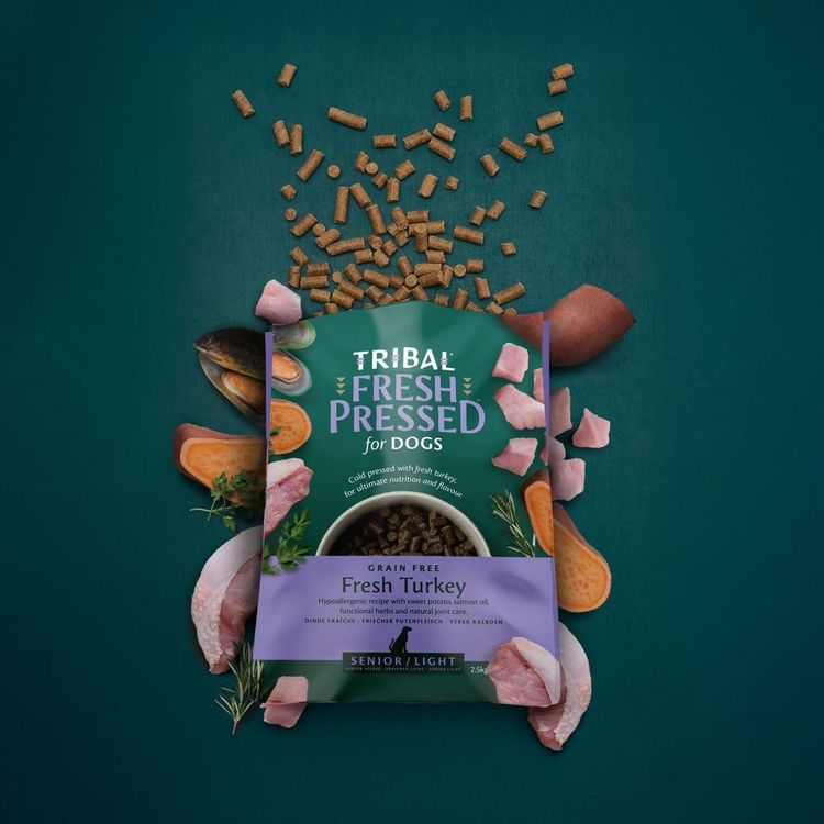 Introducing Tribal's Fresh Pressed Senior Dog Food, a carefully crafted meal designed to meet the specific needs of older canine companions. Crafted with premium fresh turkey, this nutritious formula is packed with essential nutrients and tailored to support active mobility and manage weight.