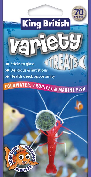 King British Variety Fish Treats are a fun and healthy treat suitable for all tropical, coldwater or marine fish. We happily give our pet dogs, cats, rabbits, or hamsters treats, and it should be no surprise that our fish will react well to treats as well! The treats are compressed discs of food that will stick to the glass of your aquarium and attract the fish. Children will love the spectacular "feeding frenzy" which can ensure, which will often bring even the shyest fish to the front of the tank. Each packet contains approx 70 treats of different flavours.
