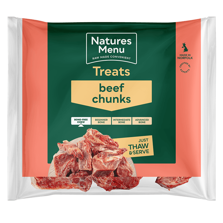 Natures Menu Natural Raw Beef Chunks for Dogs are perfect as a delicious raw treat or for adding to a home prepared raw diet, made from 100% natural, ethically sourced meat.