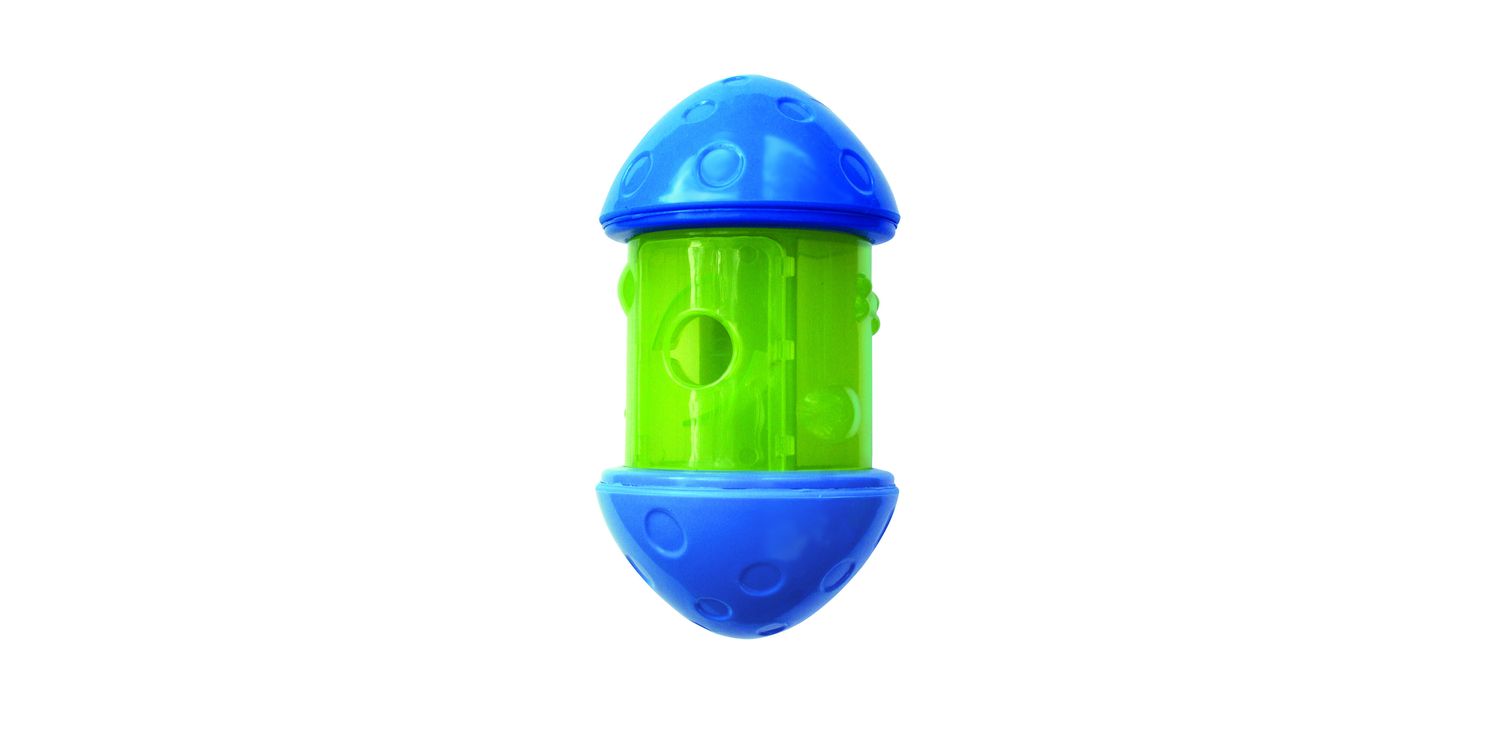 When pushed with a paw or nose KONG Spin It tempts your pup by spinning and rolling away, rewarding with treats or kibble as it moves. Built from a durable material, your dog will be sure to have ongoing mental stimulation while enjoying a yummy, entertaining experience. dog's can't resist the array of snacks spinning inside and the textured surface makes it easy to propel adding to the ongoing treat rewarding fun. Use instead of a food bowl to slow down eating and help control weight.