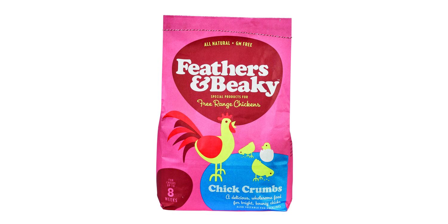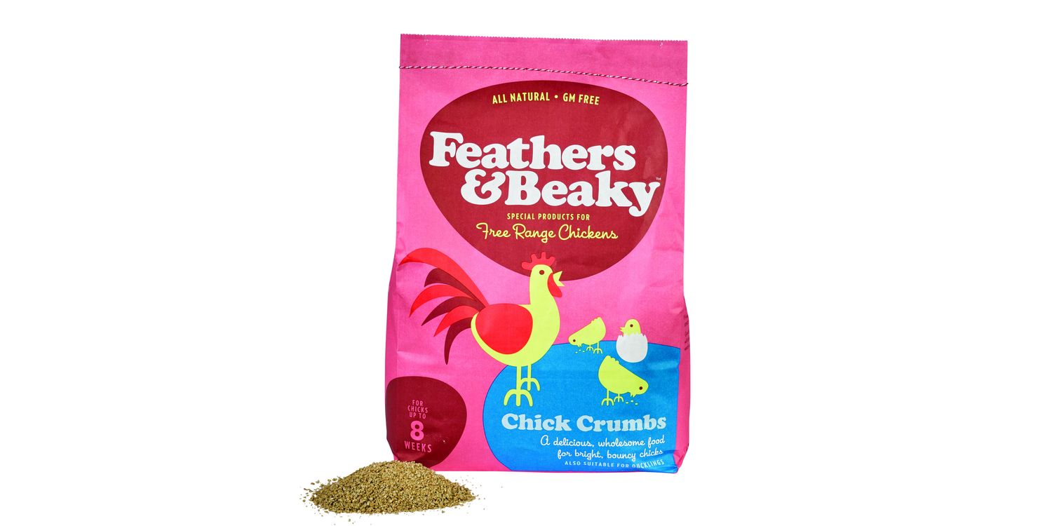 Feathers & Beaky Free Range Chick Crumbs. Premium food for chicks up to 8 weeks old. No artificial anything No GM Ingredients. Also suitable for ducklings. Ingredients: Wheat, Soya, Wheat feed, Barley, Full Fat Soya, Binder, Vegetable Fat, Limestone, Dicalcium Phosphate, Phytase Booster, Salt, Calcium Formate, Vitamin & Mineral Supplement, Lysine, Methionine.Analysis:Protein 19% Oil 3.1% Fibre 3.6% Ash 5.2% Fully compostable packaging. Zero Rated Made in GB