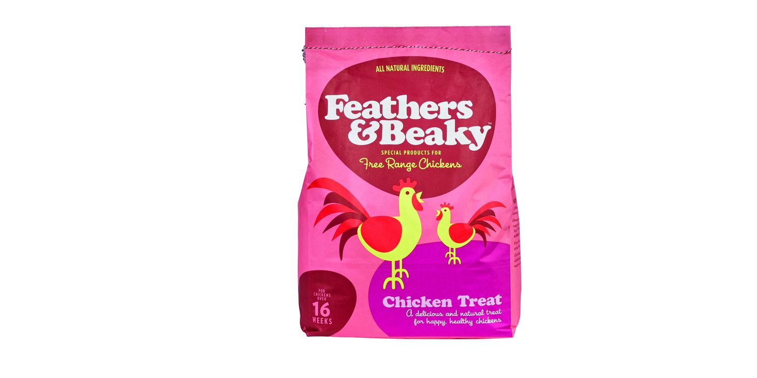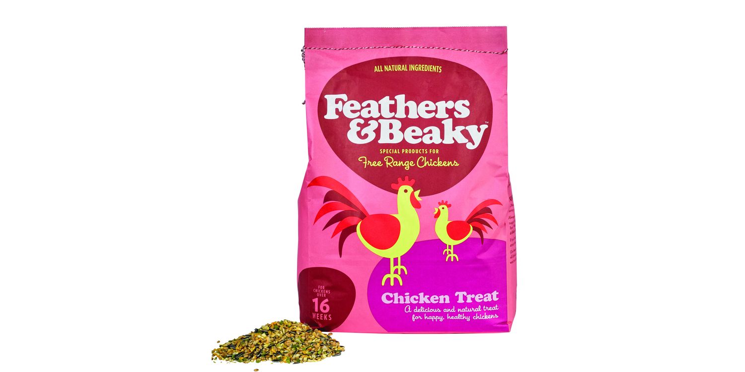 Feathers & Beaky Free Range Chicken Treat. A delicious treat for all chickens over 16 weeks. No artificial anything No GM ingredients Ideal afternoon treat Ingredients: Whole Wheat, kibbled Maize, Pea Grits, Whole Barley, Striped Sunflower, Oyster Grit, Soya Oil Fully compostable packaging. Made in GB