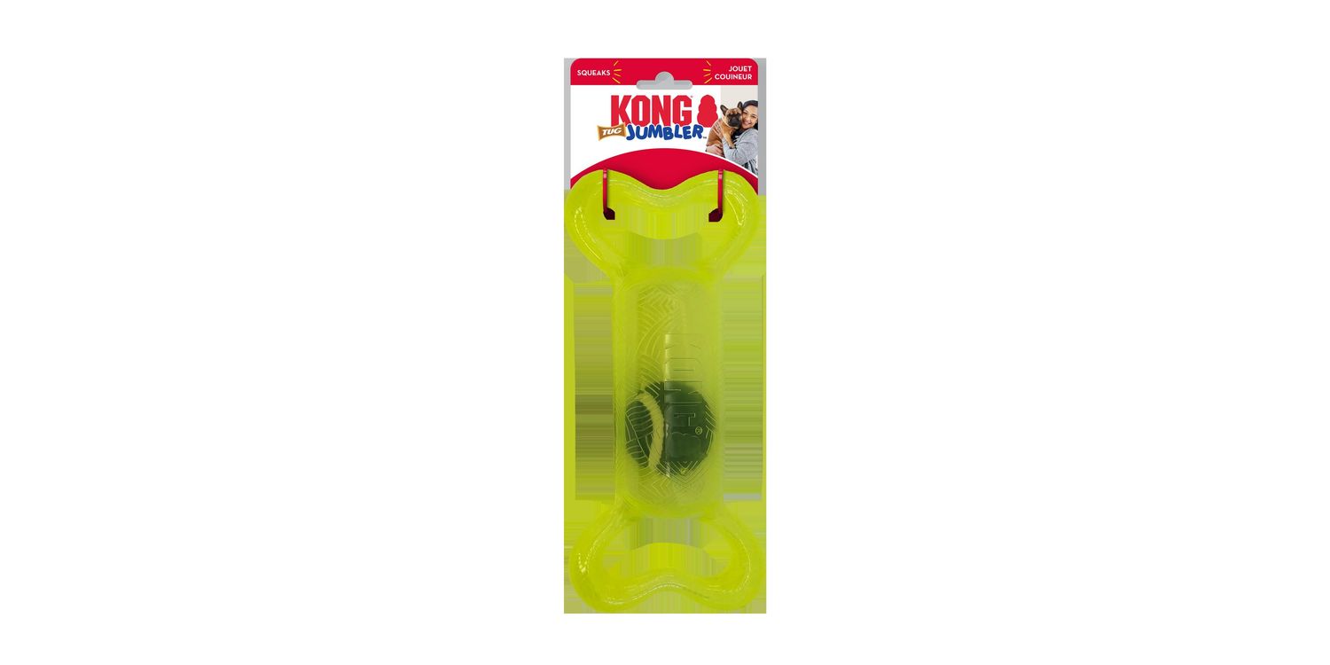 KONG Jumbler Tug Bone’s rolling interior tennis ball and loud squeak spark tug-and-fetch fun. This durable toy is built to last through tough play with two handles that make tugging and shaking easy for long-lasting rounds of interactive play.