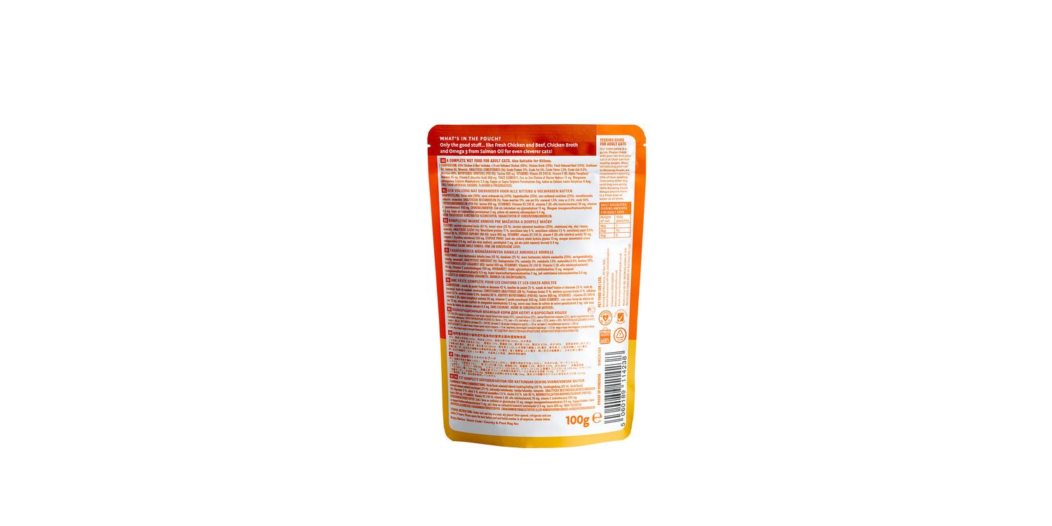 Composition:  93% Chicken & Beef includes – Fresh Deboned Chicken (43%), Chicken Broth (25%), Fresh Deboned Beef (25%), Sunflower Oil, Salmon Oil, Minerals
