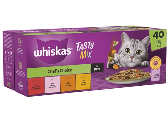 40 x Whiskas 1+ Adult Pouches Tasty Mix Chef Choice In Gravy Wet Cat Food 85g