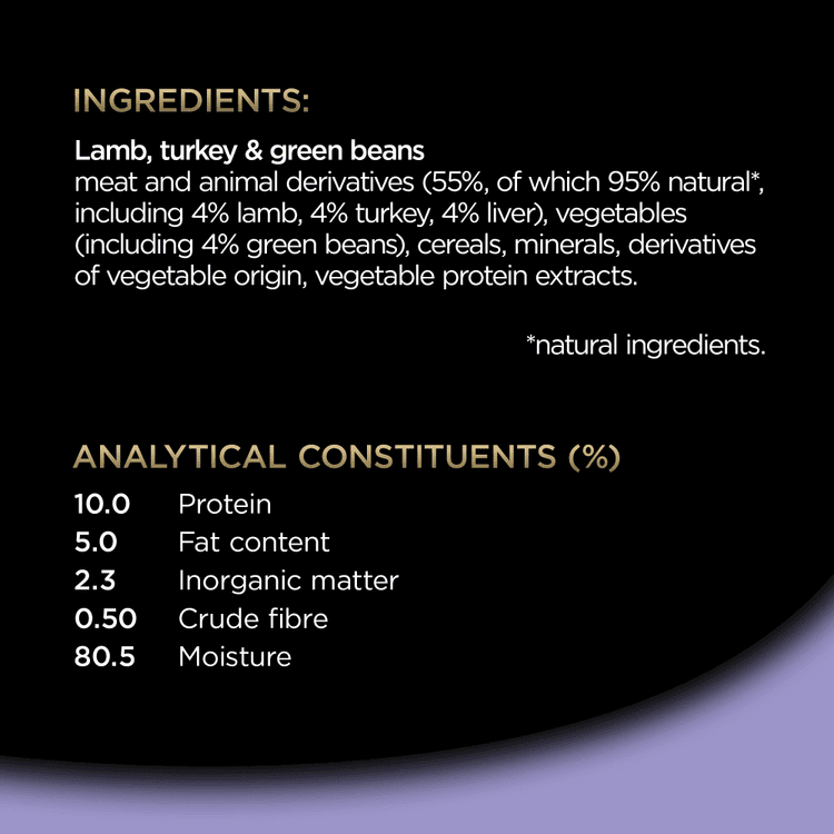Meat and Animal Derivatives (55%, of which 95% Natural*, including 4% Lamb, 4% Turkey, 4% Liver), Vegetables (including 4% Green Beans), Cereals , Minerals, Derivatives of Vegetable Origin, Vegetable Protein Extracts, *Natural ingredients