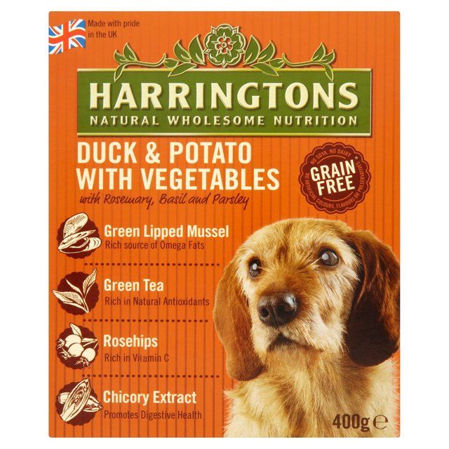 Harringtons Complete Wet Duck & Potato is a complete dog food suitable for all adult dogs. Formulated to a Grain Free recipe with 60% Duck and 100% natural healthy ingredients. With Green Lipped Mussel a rich source of omega fats, Glucosamine and Chondroitin, Green Tea for natural antioxidants, Rosehips for Vitamin C, Chicory Extract for digestive health, Dried Tomato for natural Lycopene, Kelp for natural minerals and trace elements and Botanical Herbs including Parsley, Basil and Rosemary. With no soya, no dairy and no artificial colours, flavours or preservatives. Made with pride in the UK.