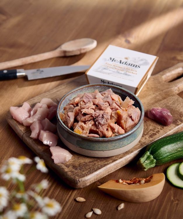 Indulge your dog companion with McAdams Free Range Chicken with Free Range Turkey, a natural and grain-free wet food crafted with love from whole British free-range chickens and turkeys sourced from DEFRA-approved ethical farms across the UK. This carefully formulated diet caters to all life stages, providing essential nutrients in a highly digestible form.